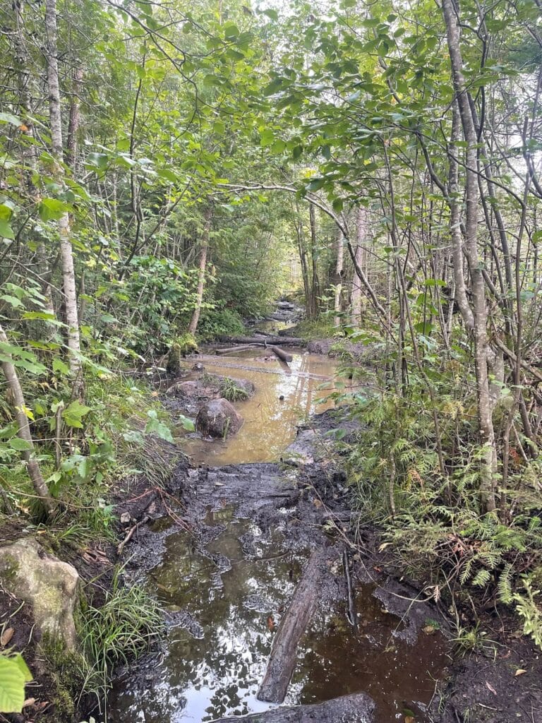 While the campsite on Moose had a lovely view, the tent pads were less than desirable, so we decided that the next morning we’d move on. We got up before the sun and enjoyed packing up while watching the fog dissipate from the lake and listening to the loon calls echo off the cliffs like a joyful chorus welcoming the day. After a short paddle to the end of Moose, we were at the start of three portages. Traveling east to west, there wasn’t much elevation, which I would have gladly taken over what we found on the Lesser Cherry Portage. Most of the 90-rod portage was deep, slick mud and muck. It was slow going, watching every step. We both slipped and nearly fell, but what we found at the end made the challenge worth it.