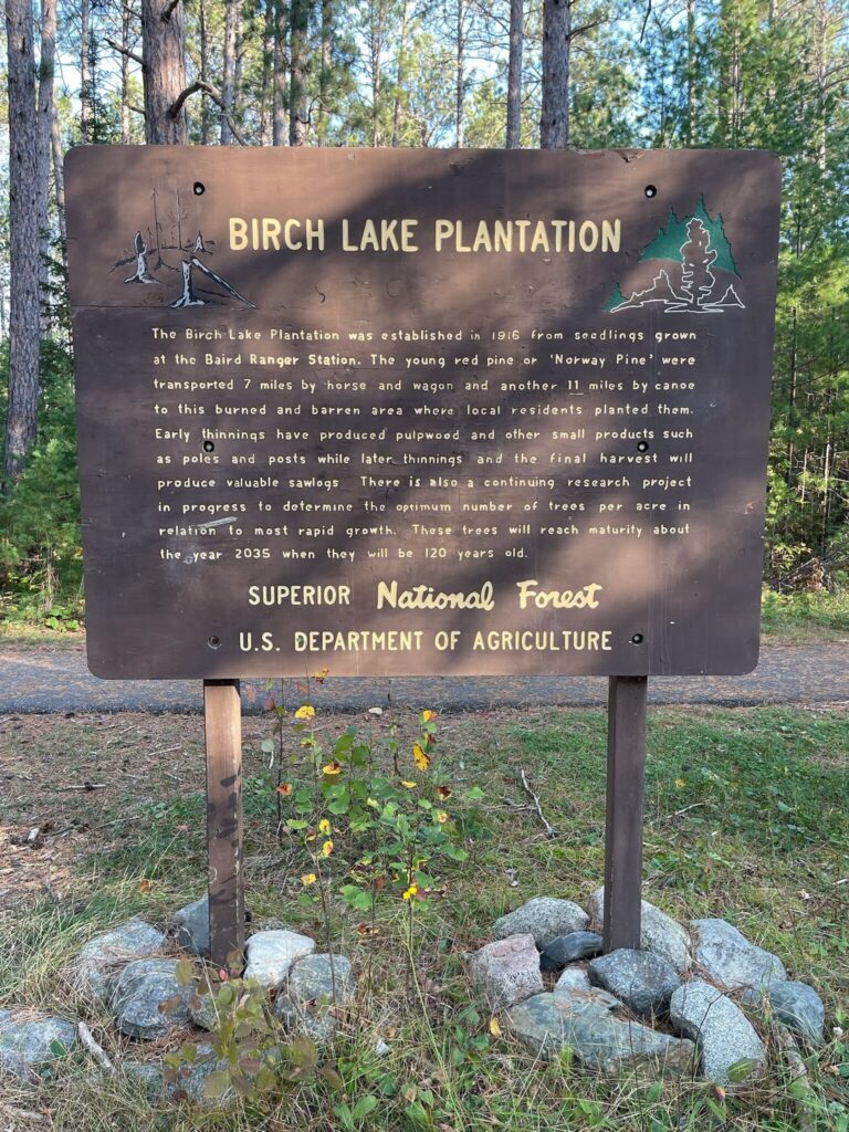 We grabbed some fruit to fuel up for our hike, then headed over to the interpretive sign near the parking area to learn about this hidden gem. The sign reads, “The Birch Lake Plantation was established in 1916 from seedlings grown at the Baird Ranger Station. The young red pine or ‘Norway Pine’ were transported 7 miles by horse and wagon and another 11 miles by canoe to this burned and barren area where local residents planted them. Early thinnings have produced pulpwood and other small products such as poles and posts while later thinnings and the final harvest will produce valuable sawlogs. There is also a continuing research project in progress to determine the optimum number of trees per acre in relation to most rapid growth. These trees will reach maturity about the year 2035 when they will be 120 years old.”