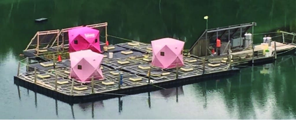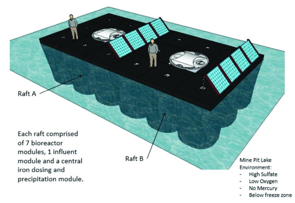 Engineers have taken and replicated the mobile lab’s sulfate clean-up system in the field on floating modular platforms. The bioreactor cells form “islands” that host sulfate-reducing bacteria in containment vessels. The system can scale up or down to meet sulfate removal needs.