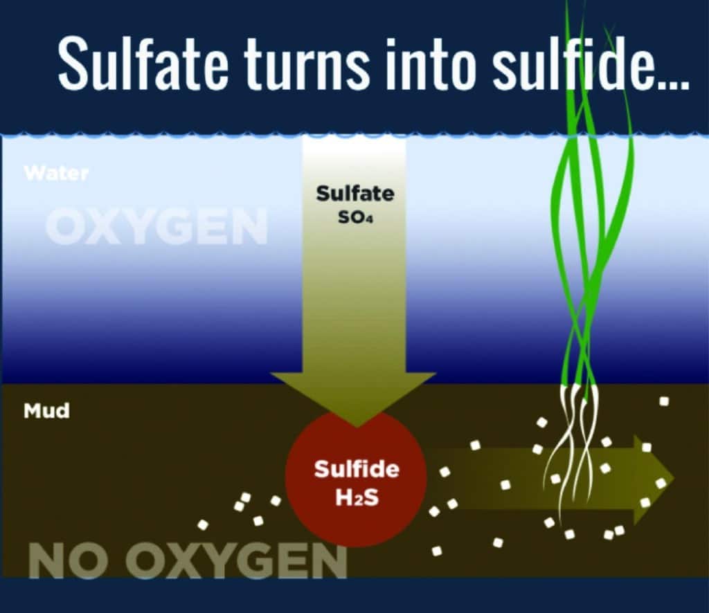 Sulfate remains active in oxygen-rich environments. It migrates into sediment and mud, where microbes consume the available oxygen. Sulfate-reducing bacteria then take over, stripping oxygen from the sulfate so they can breathe. They continue consuming biomass, and this biological process produces hydrogen sulfide, the rotten egg smell most people recognize. Hydrogen sulfide is toxic to both humans and wild rice.