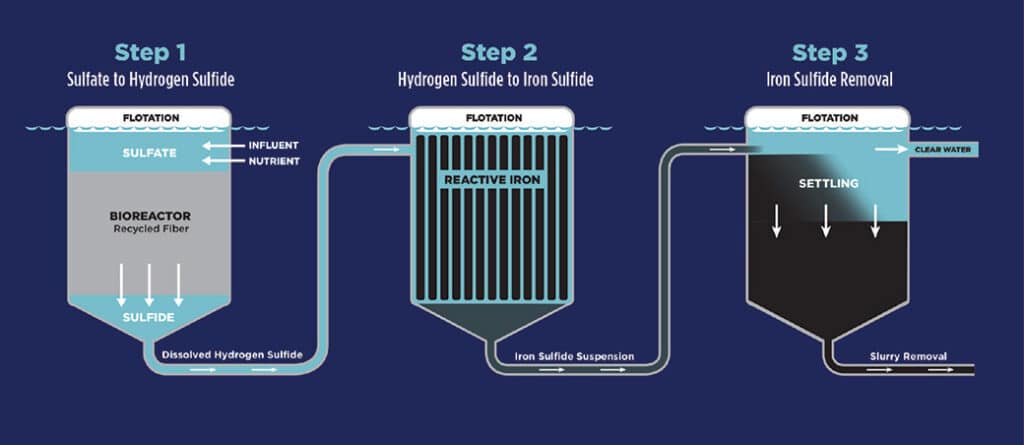 A small bag outside the tank holds a liquid biodegradable solution that feeds the bacteria. These bacteria breathe by using the oxygen bound in sulfate molecules, which allows them to break down the sulfate. Then, moving through a bioreactor treatment, the process converts sulfate into hydrogen sulfide.