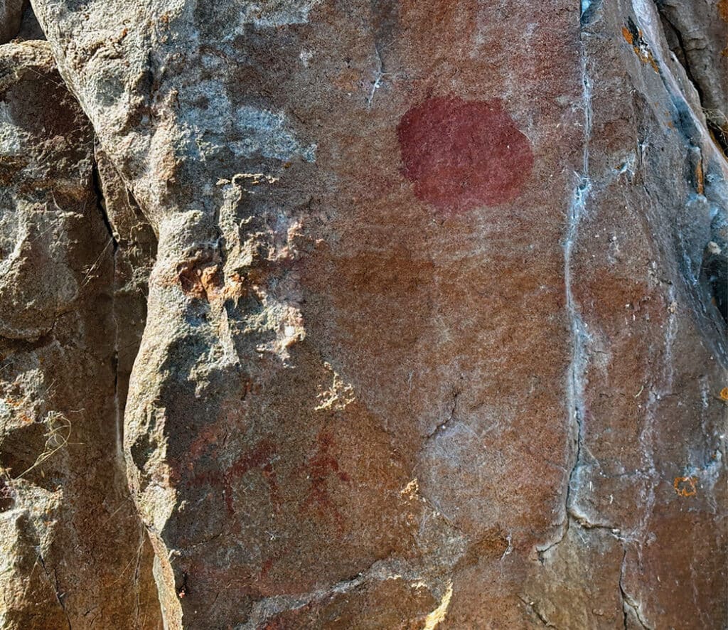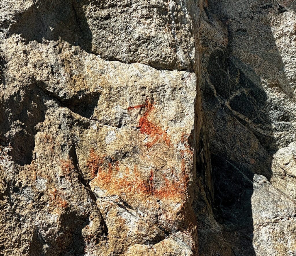 As we approached a dramatic granite shelf, streaks of black, gray, red, and orange colored the stone. Stains from rainwater and patches of lichen were taking over. Slowly, as we paddled past, the pictographs began to reveal themselves. The first image looked like an animal with a long tail; perhaps a mink.