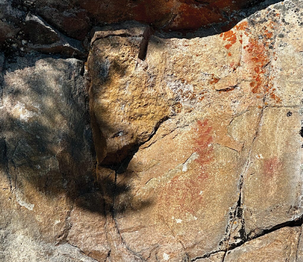 Then we saw the best-known trio: a group of rust-colored moose, high on a prominent section of rock, two adults and what appeared to be a calf. Nearby, a crane stood above a canoe filled with people. We drifted along the rock face, letting our eyes adjust. Our gaze drew upward as we paused, searching. More images emerged: another human figure, a circular shape resembling the sun or moon, more canoes, some showing adults and children, animal shapes, part of a caribou, and a scattering of Xs. Each time we visit this site, we discover something new.