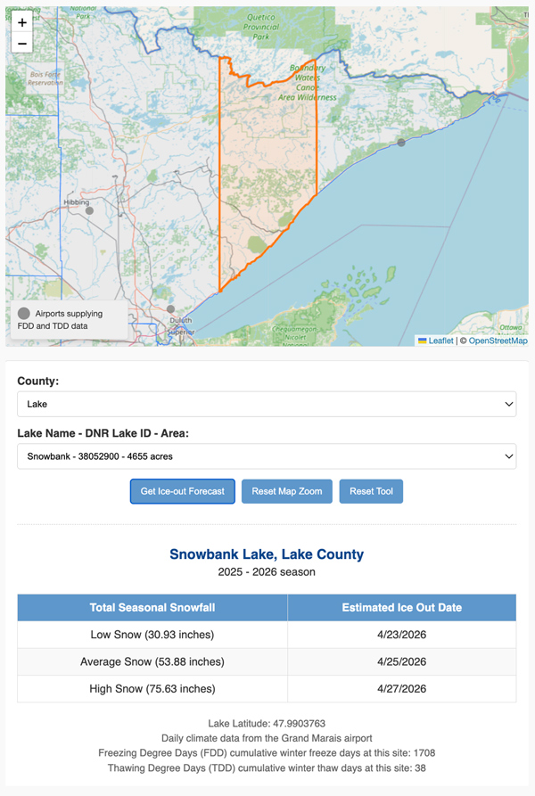 Online buzz has begun about when the ice will be gone on Boundary Waters lakes. Using scientific and historical data, the Minnesota Sea Grant has updated its online thaw tracker to estimate when ice will disappear from Minnesota lakes. They recently held a recorded webinar to help users understand this data and the science behind how forecasts are made.